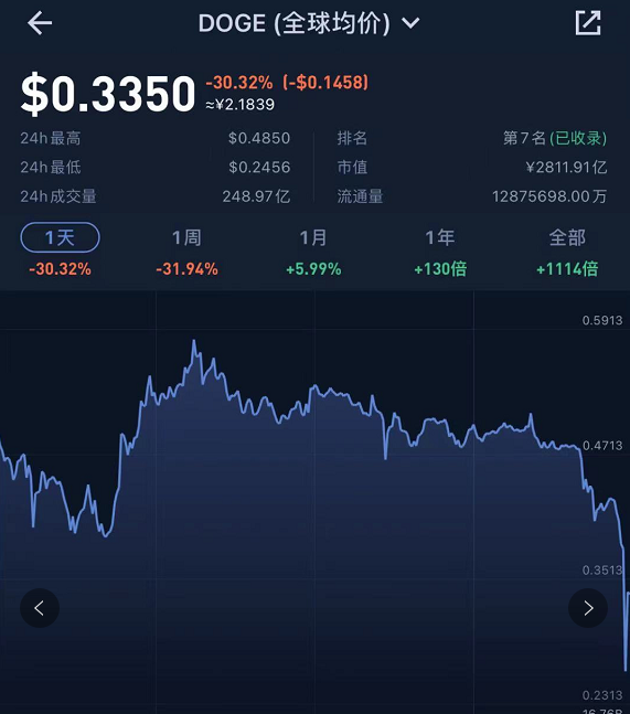 5月19日虚拟货币全线暴跌。比特币一度跌破31000美元,24小时内跌幅达30%,创今年1月底以来新低;以太坊跌破2000美元大关,跌超40%;狗狗币失守0.3美元/枚,日内跌超40%。